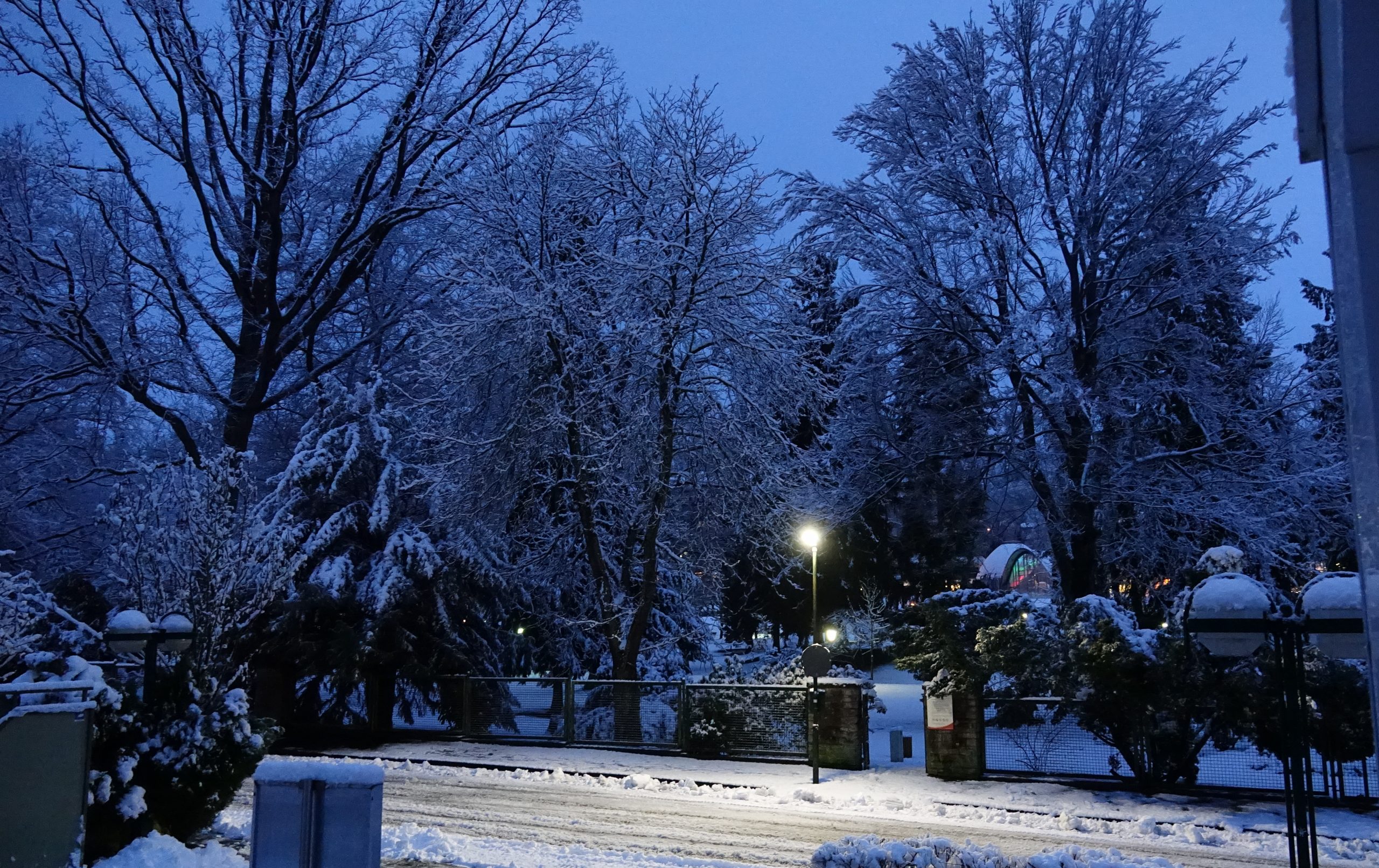 - In den frühen Morgenstunden, der Himmel war grau, die Laternen brannten noch, durch die wunderschön verschneiten Bäume hindurch konnte man auf die Toskana-Terme sehen, sogar die farbigen Lichter des Schwimmbades sind gut zu erkennen. Einfach ein schöner Wintertag
