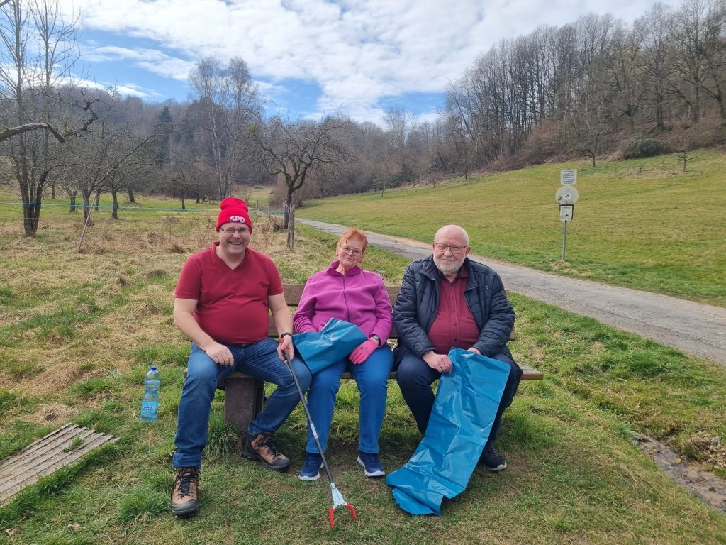 Der SPD Ortsverein Bad Orb hat sich am Umwelttag der Stadt Bad Orb beteiligt. Bei herrlich sonnigen Wetter hatte sich der Ortsverein am 22. März die Gegend um den Bolzplatz zur Grundreinigung vorgenommen. „Wir waren alle doch darüber überrascht, wie sauber es am Bolzplatz, der dortigen Umgebung und das Leimbachtal hoch ist“, so der Vorsitzende des SPD Ortsvereins, Dr. Olaf Neuschaefer-Rube. Nach getaner Arbeit trafen sich alle teilnehmenden Müllsammler nochmal in der Unterkunft des THW zu einer Limo und Bockwürschen.